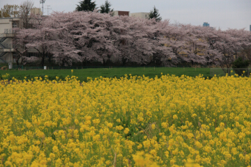 保育園前から撮影。黄色と緑色と満開の桜色。